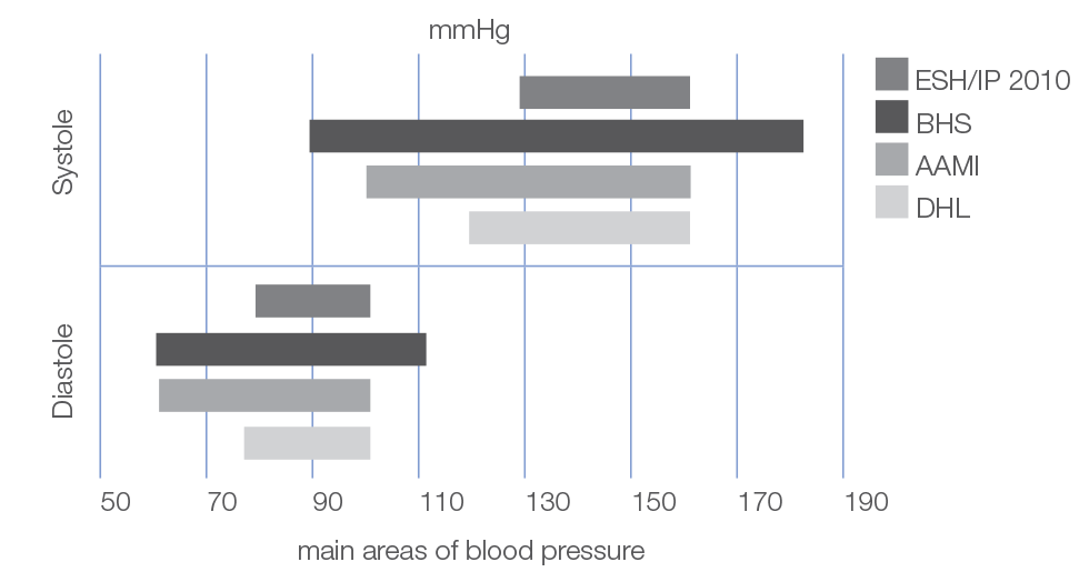 Les plages de tension artérielle examinées montrent une autre différence : les plages de tension artérielle pour lesquelles la précision de mesure des tensiomètres est contrôlée diffèrent selon le protocole (voir graphique). Plus la plage de mesure est étendue, plus les appareils sont réputés fiables pour une tension artérielle extrêmement basse ou extrêmement élevée.